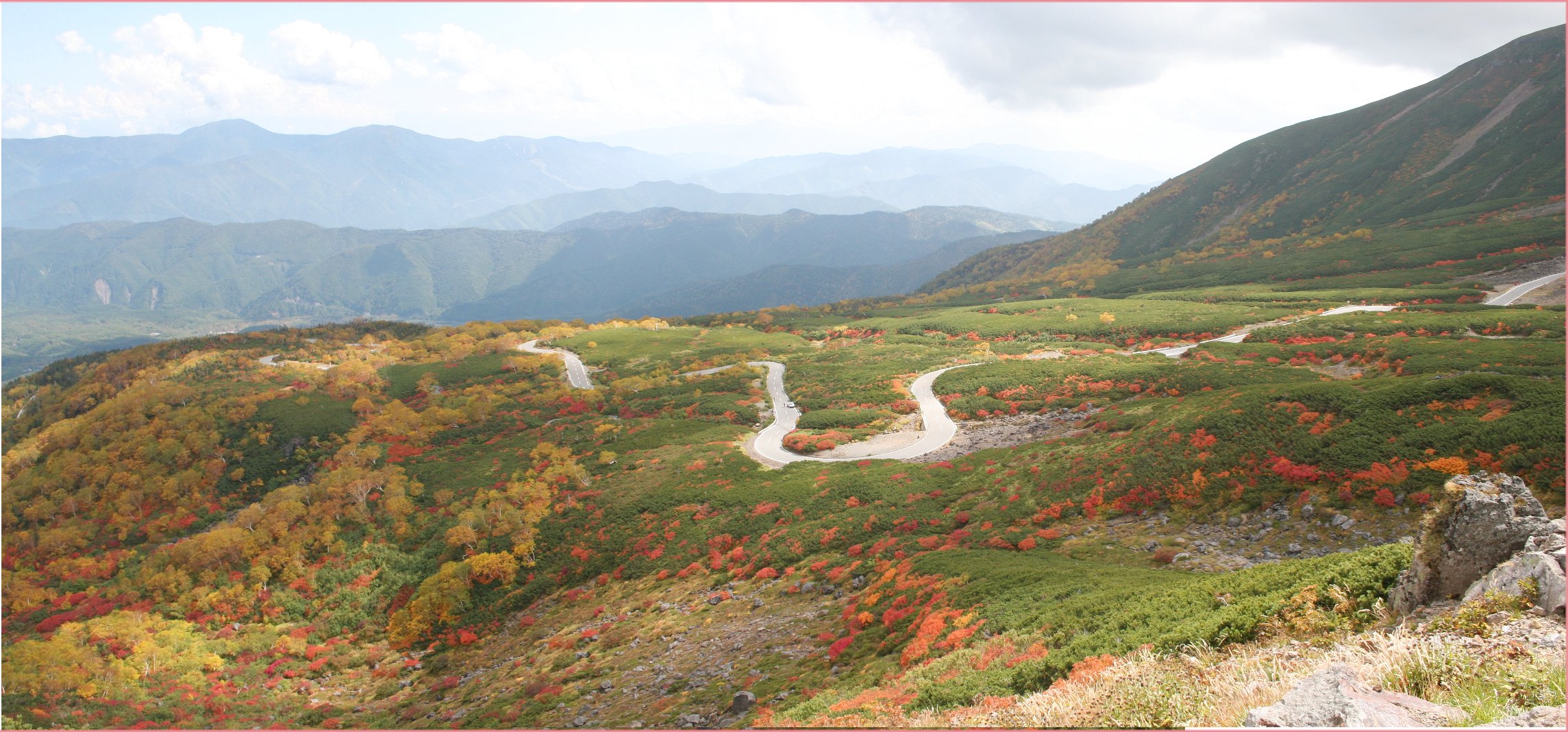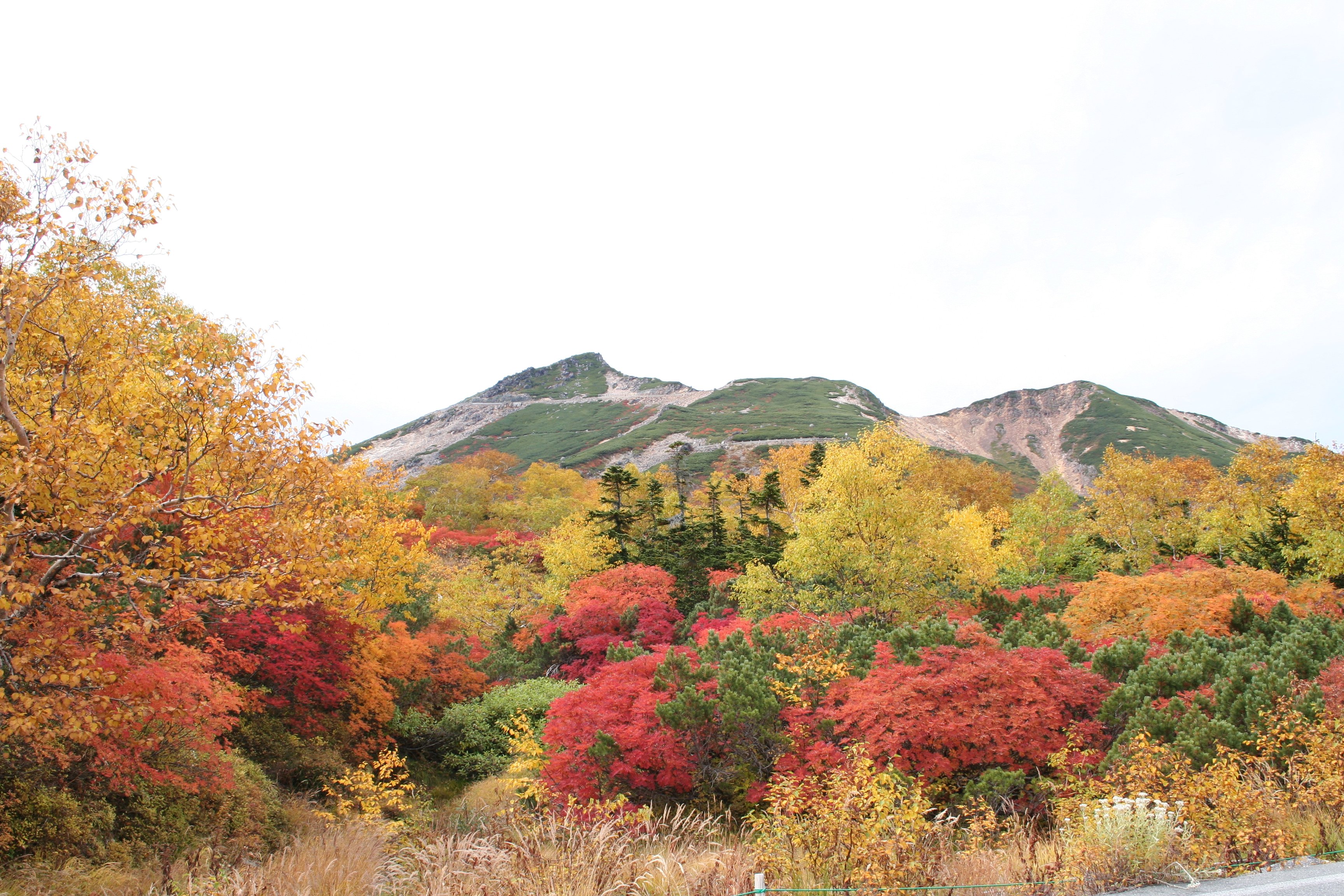 北アルプス乗鞍岳(標高3,026m)の裾野に広がる山岳高原 乗鞍では 大雪渓下(標高2,600m)ハイマツ&ナナカマドの鮮やかなコントラストに始まり 紅葉前線が高原入口(標高1,200m)迄、一ヶ月余をかけ下ってきます。